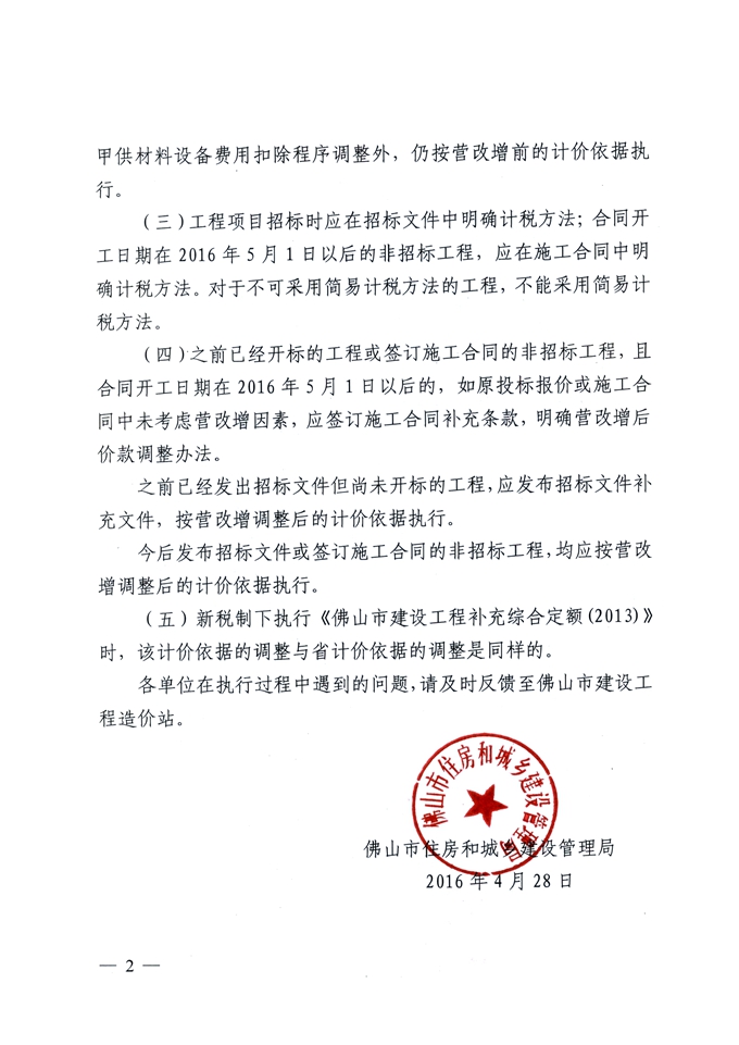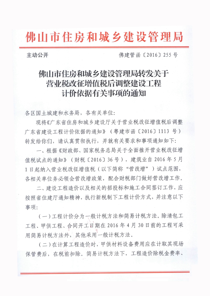 佛山市住房和城乡建设管理局转发九州在线登录营业税改征增值税后调整建设工程计价依据有关事项的通知