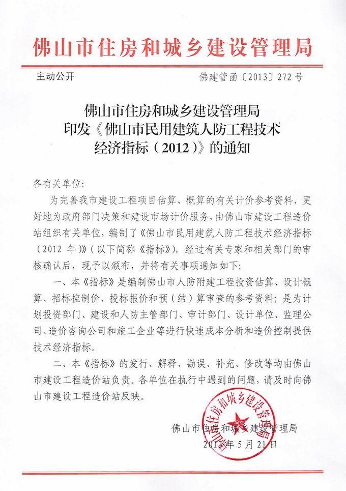 佛山市住房和城乡建设管理局印发《佛山市民用建筑人防工程技术经济指标(2012)》的通知