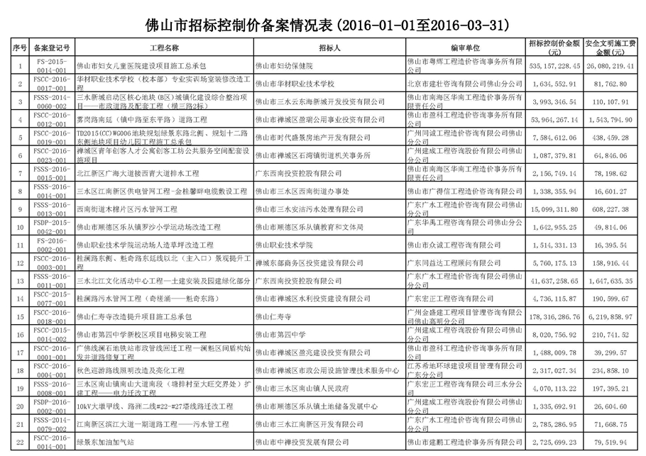 佛山市招标控制价备案情况表(2016-01-01至2016-03-31)