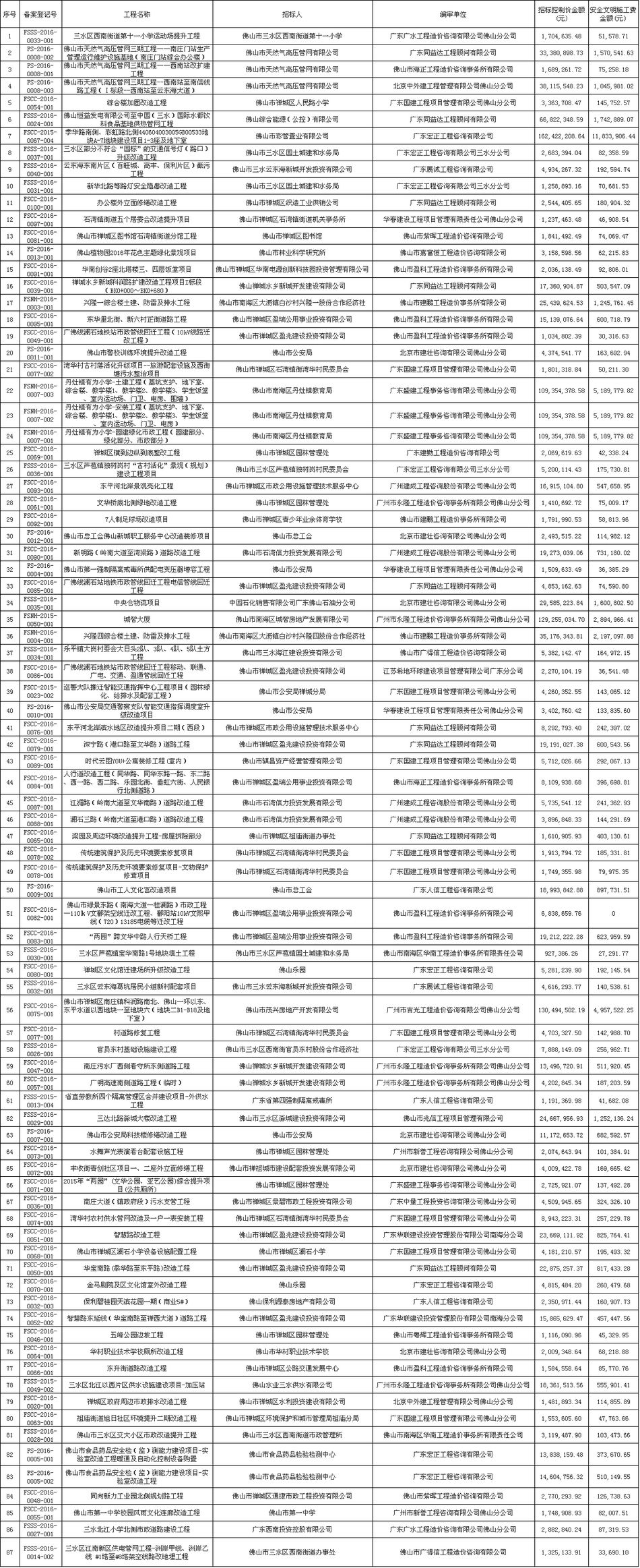 佛山市招标控制价备案情况表(2016-07-01至2016-09-30)