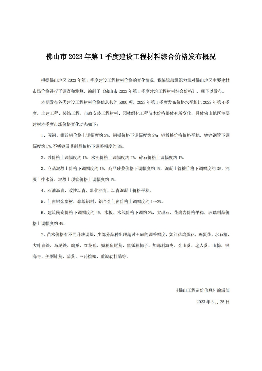 佛山市2023年第1季度建设工程材料综合价格发布概况