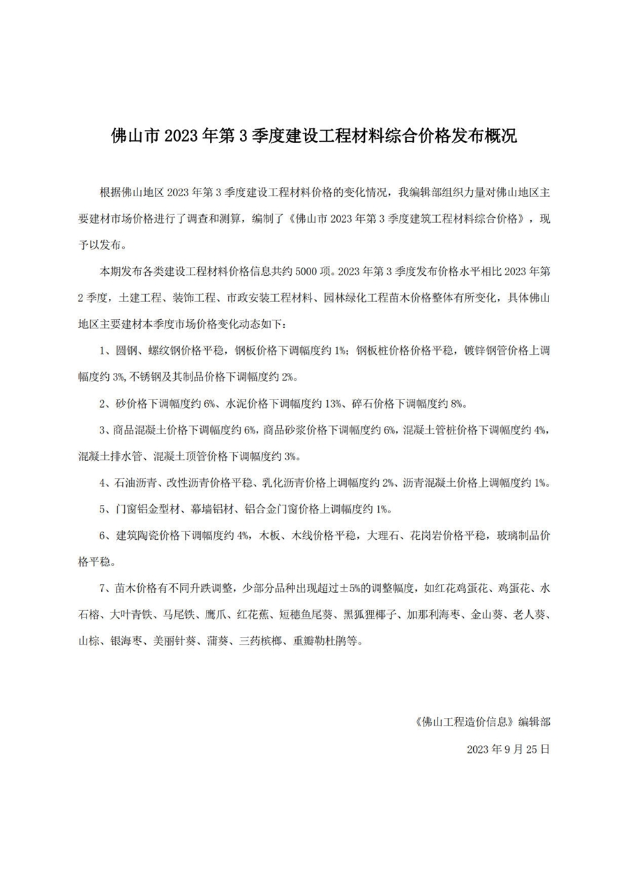 佛山市2023年第3季度建设工程材料综合价格发布概况