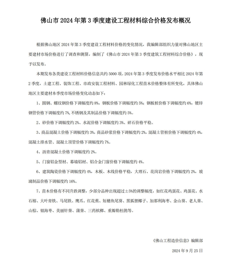 佛山市2024年第3季度建设工程材料综合价格发布概况