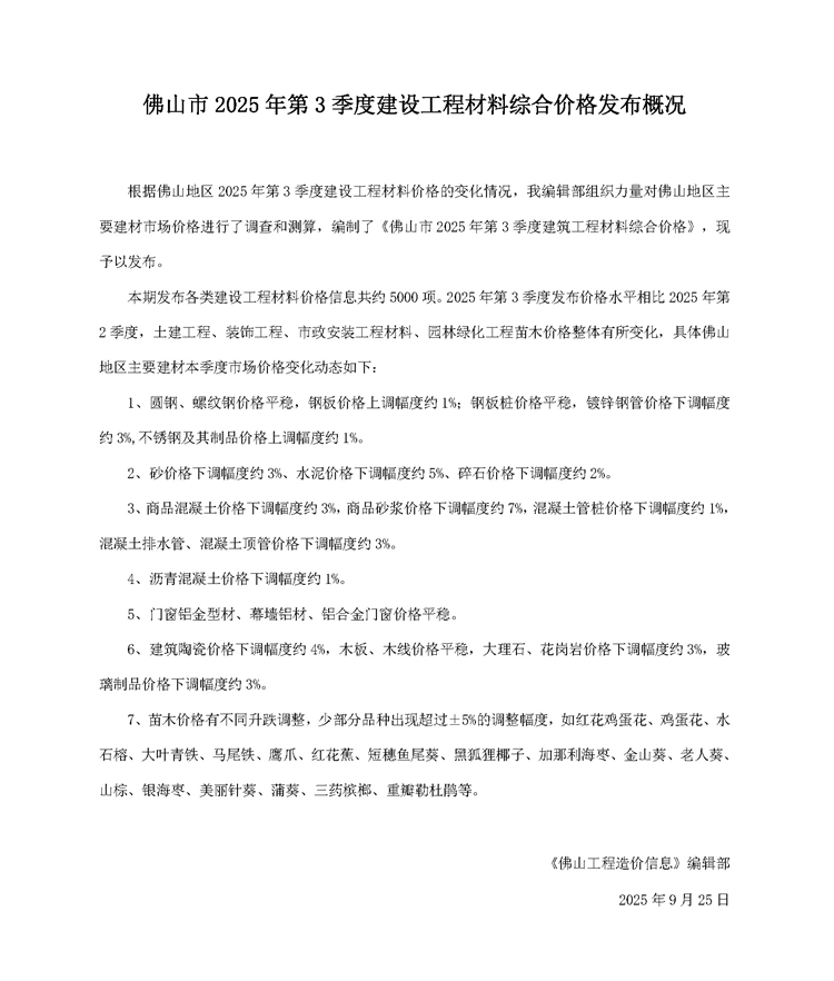佛山市2025年第3季度建设工程材料综合价格发布概况