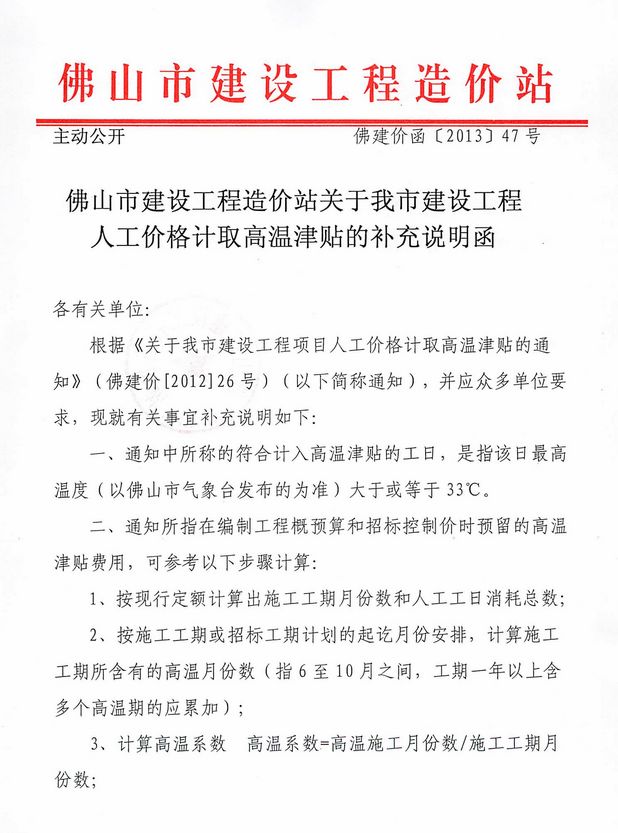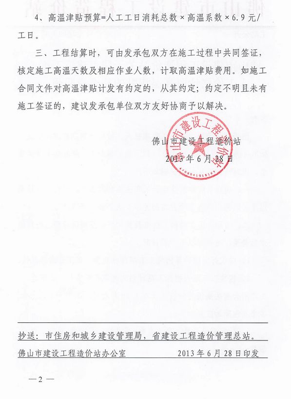 佛山市建设工程造价站九州在线登录我市建设工程人工价格计取高温津贴的补充说明函