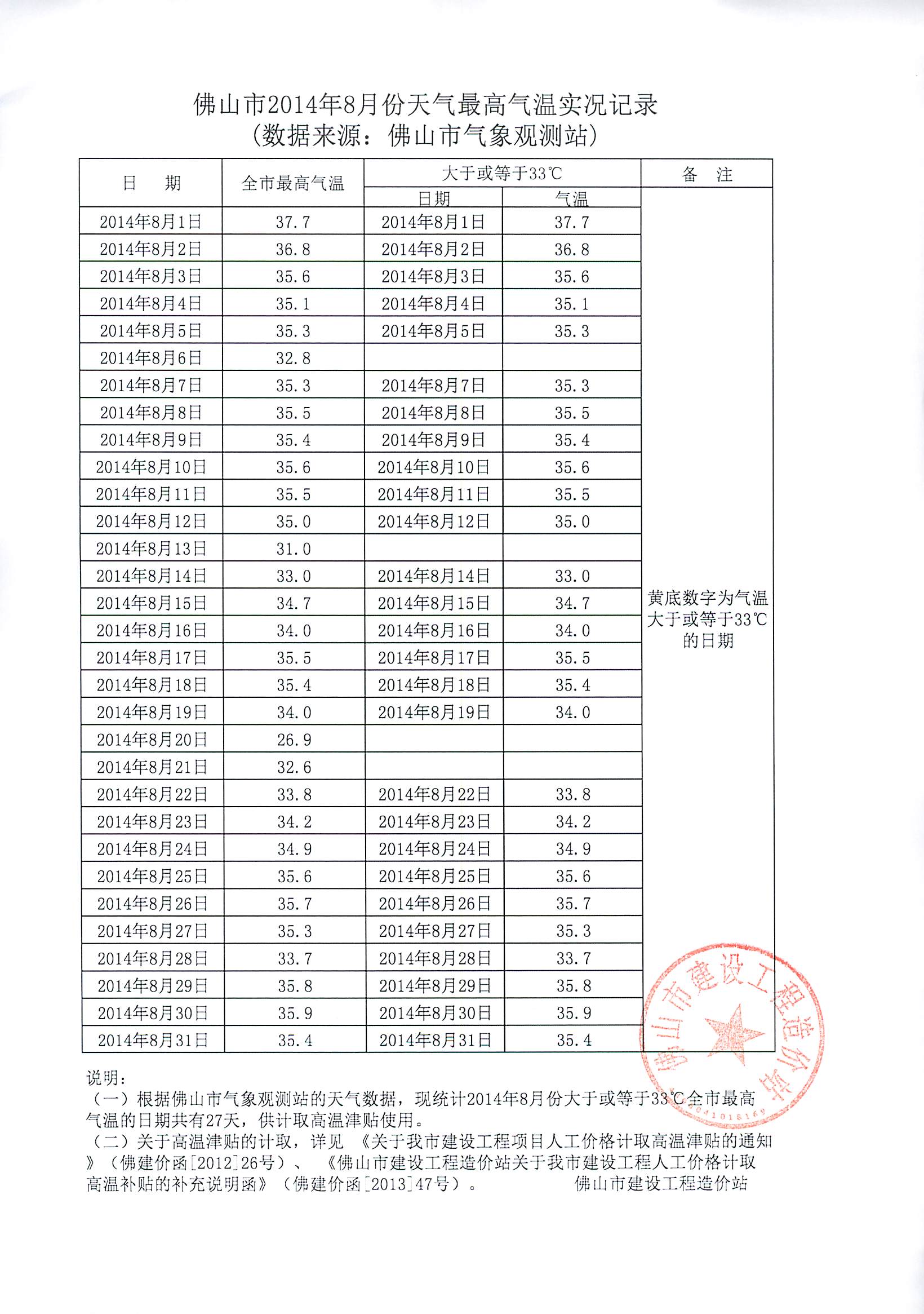 佛山市2014年8月份天气最高气温实况记录