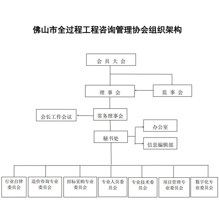 协会前身为佛山市工程造价协会,随着建筑业改革不断深入,我协会根据各时期发展需要,为进一步整合资源,适应行业改革要求,经市民政局批准,曾三易其名,于2015年7月更名为佛山市工程造价与招标协会,2018年2月更名为佛山市造价咨询与招标采购协会,协会于2021年8月正式更名为佛山市全过程工程咨询管理协会,成为全国首家也是目前唯一由单一专业的造价行业协会发展为综合性(涵盖投资咨询、勘察、设计、监理、招标代理、政府采购、造价咨询、项目管理等全链条)的全过程工程咨询管理协会。协会现有会员单位177家,理事会成员共57名(其中会长1名、副会长17名、理事39家),监事会成员3名。于2018年成立党支部,2019年被评为5A级社会组织,并于2024年重新复评为5A级社会组织。协会设立秘书处,下设办公室和信息编辑部两个部门及统筹管理七个专业委员会,七个专业委员会分别是:行业自律委员会、造价咨询专业委员会,招标采购专业委员会,项目管理专业委员会,数字化专业委员会、专业人员委员会、专业技术委员会,并建立协会专家库、造价改革技术研究部和建设工程合同造价纠纷调解中心。