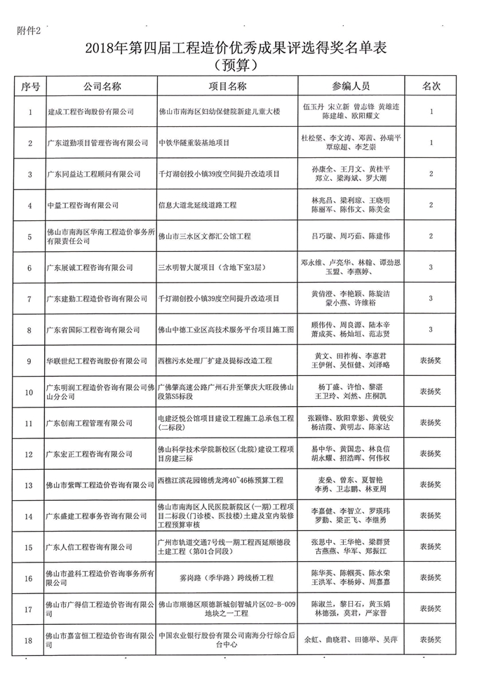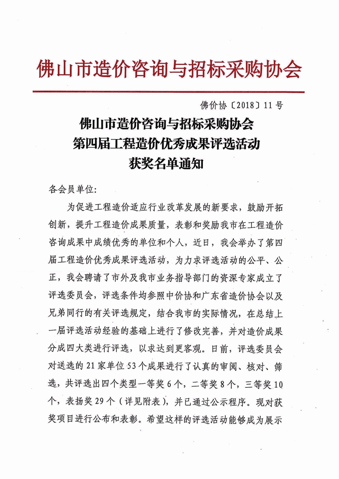 佛山市造价咨询与招标采购协会第四届工程造价优秀成果评选活动获奖名单通知