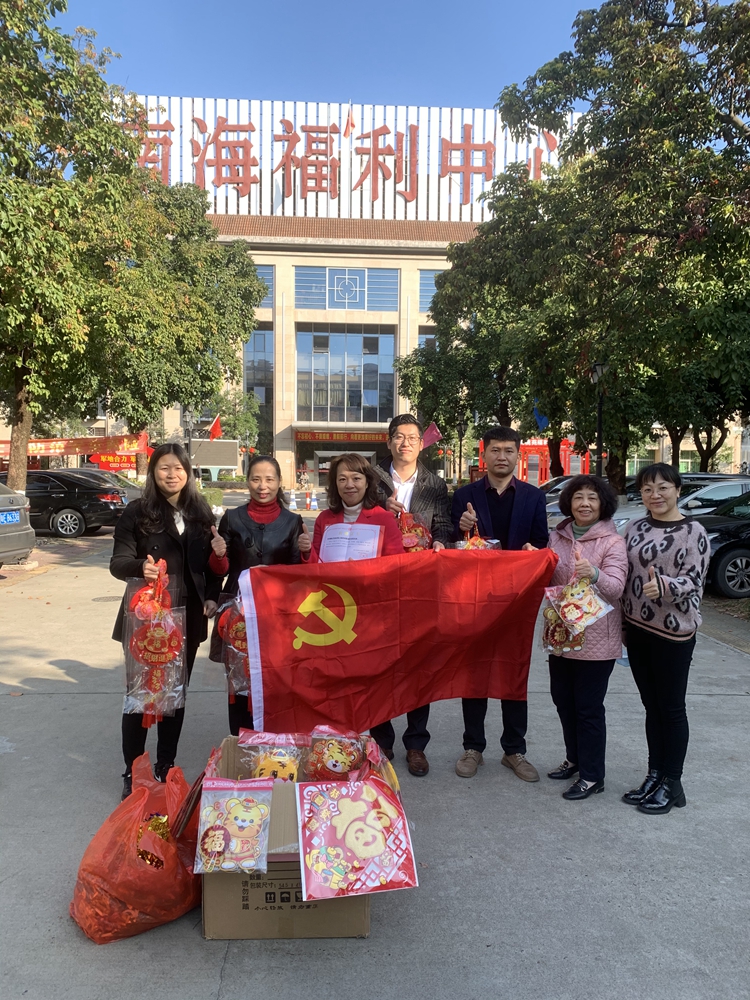 由于受疫情影响,我市各养老机构均处于封闭管理状态,老人们春节未能回家与亲人团聚,为使老人们享受新春佳节的欢乐,为他们营造欢乐祥和的气氛,1月19日,我党支部开展新春敬老活动,在罗瑛玮书记的带领下,前往南海福利中心为1000多名老人赠送了新春贺年装饰礼品,为他们献上我们一份诚挚的祝福,传递了社会对他们的关爱,体现了我党支部对公益慈善事业的支持!