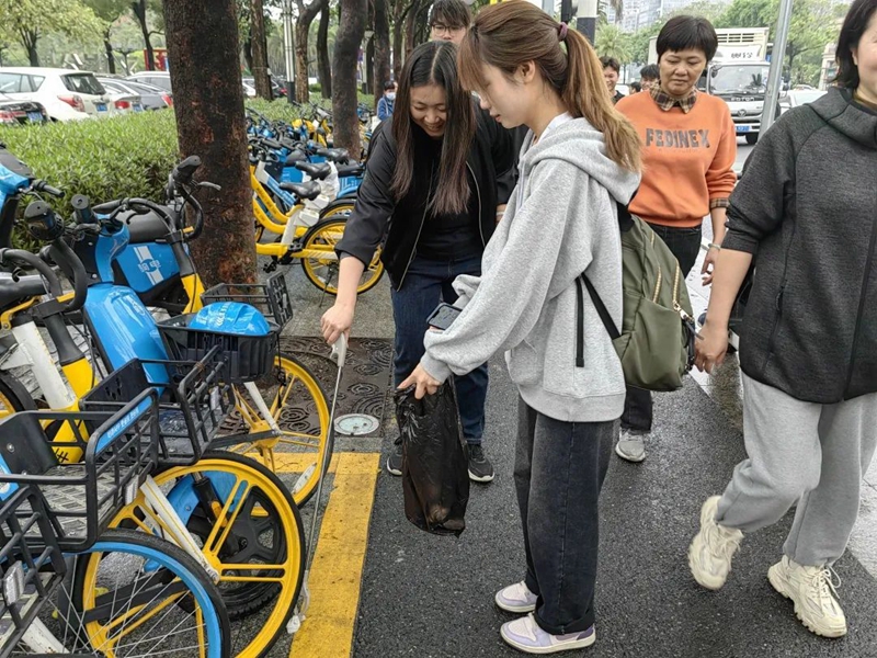 在行进过程中,参加活动的大家开启另一重身份——环保公益志愿者,志愿者们拿着垃圾夹,将市民丢弃的垃圾,大的如塑料瓶、包装袋,小的如烟头、纸屑,全部装入垃圾袋中,扶正被风雨吹倒的共享自行车,以实际行动宣传垃圾分类、保护生态、创建文明城市的理念,倡导节能减排、低碳出行,为佛山打造绿色宜居环境贡献社会组织的一份力量。