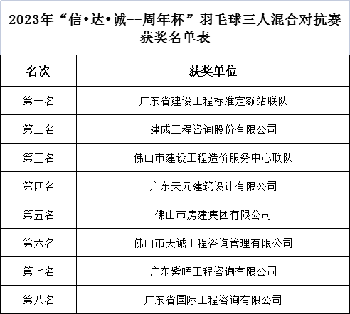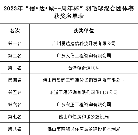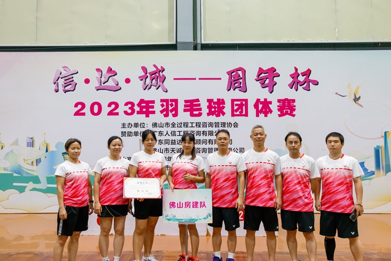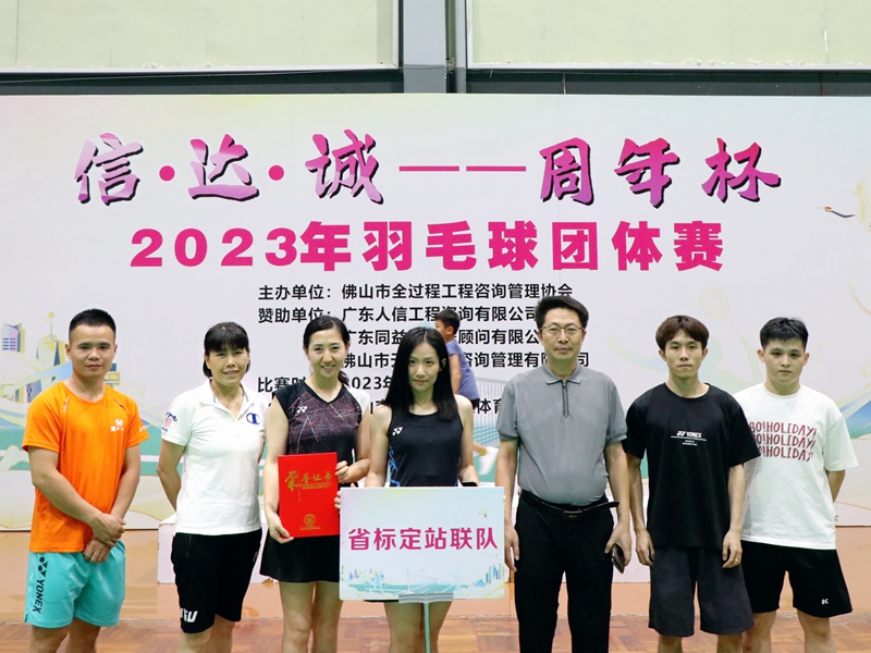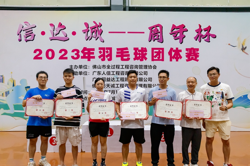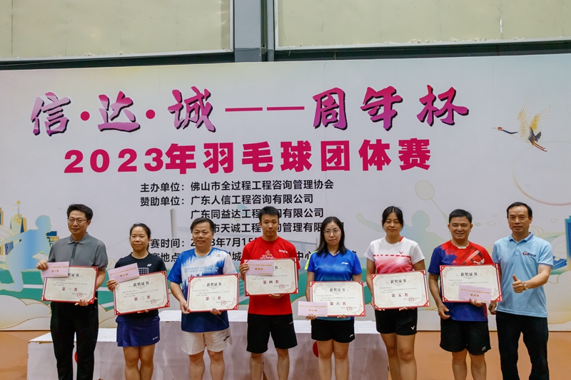 2023年“信•达•诚--周年杯”羽毛球团体赛至此圆满落幕。在此特别鸣谢广东人信工程咨询有限公司、广东同益达工程顾问有限公司、佛山市天诚工程咨询管理有限公司三家公司的鼎力支持,同时感谢所有参赛选手和工作人员积极参与,期待一下届的“展诚杯”再相聚。