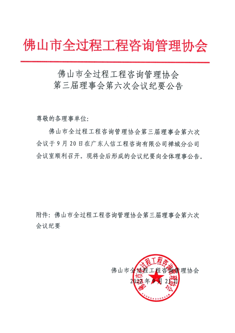 佛山市全过程工程咨询管理协会第三届理事会第六次会议纪要公告