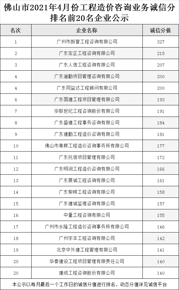 佛山市2021年4月份工程造价咨询业务诚信分排名前20名企业公示
