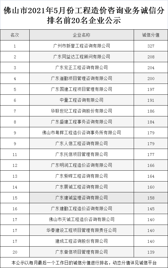 佛山市2021年5月份工程造价咨询业务诚信分排名前20名企业公示