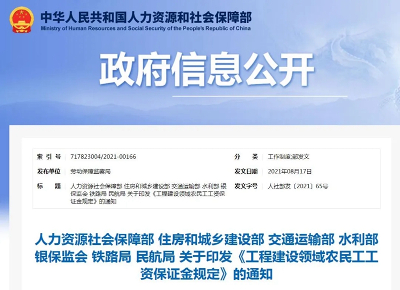 近日,根据《保障农民工工资支付条例》授权,人力资源社会保障部、住房和城乡建设部、交通运输部、水利部、银保监会、铁路局、民航局制定了《工程建设领域农民工工资保证金规定》,现已印发。