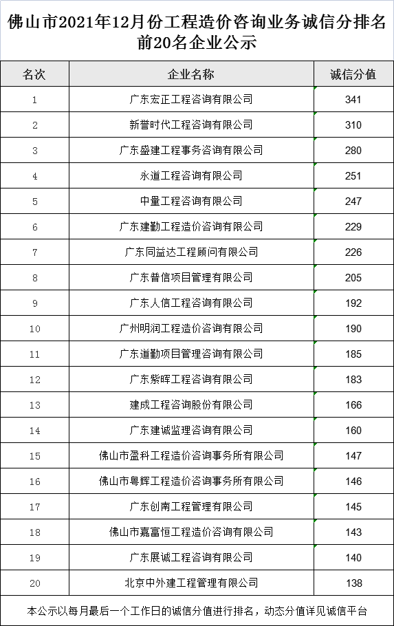 佛山市2021年12月份工程造价咨询业务诚信分排名前20名企业公示