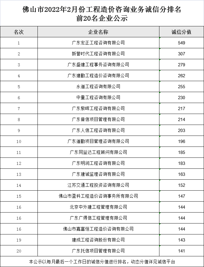 佛山市2022年2月份工程造价咨询业务诚信分排名前20名企业公示