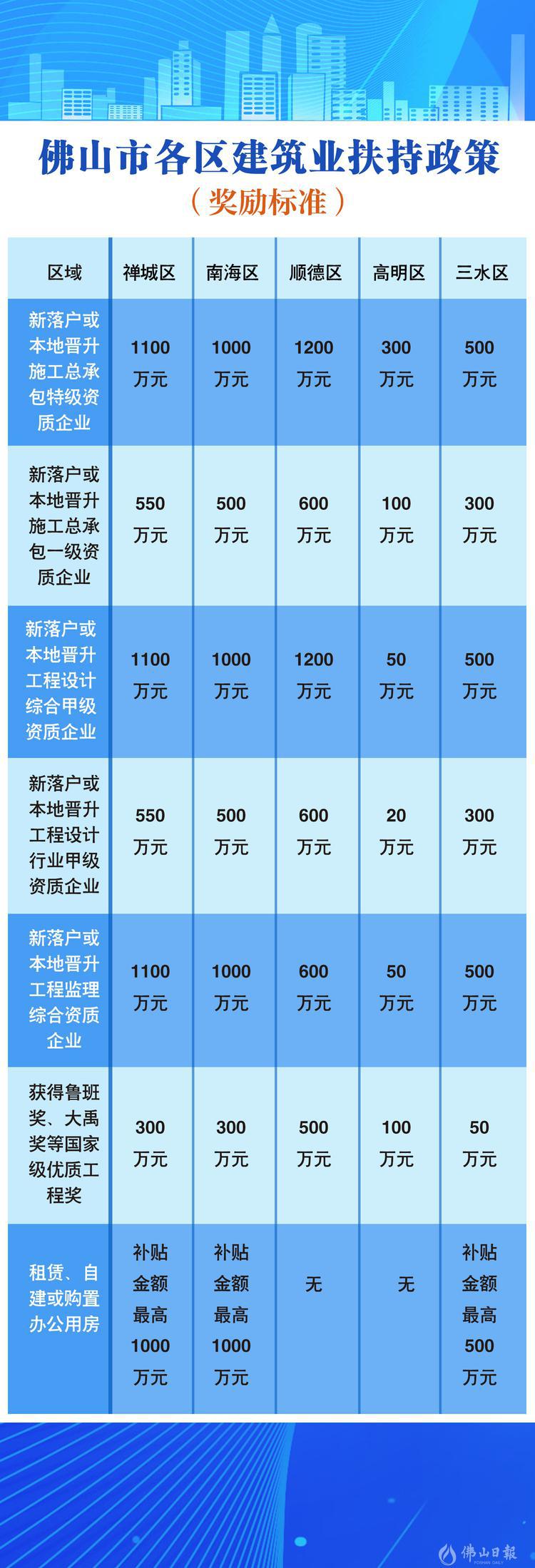 2020年以来,佛山出台《佛山市建筑业发展规划(2019-2023)》,五区也配套出台扶持政策。系列政策对新落户或本地晋升资质的建筑企业、荣获国家级优质工程奖的建筑企业,以及租赁、自建或购置办公用房的建筑企业,有数十万元到上千万元的扶持,扶持金额最高达1200万元。