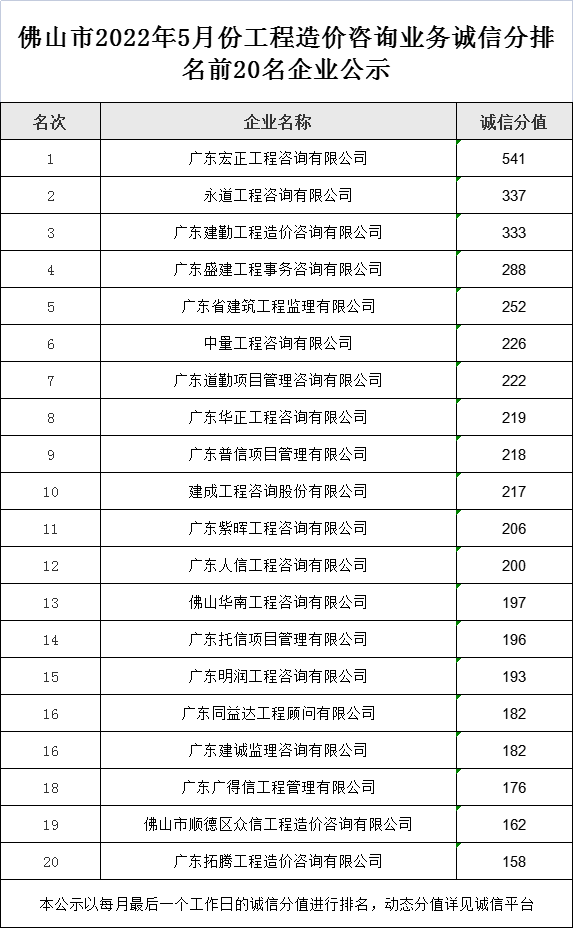 佛山市2022年5月份工程造价咨询业务诚信分排名前20名企业公示