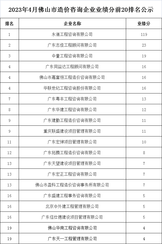 2023年4月佛山市造价咨询企业业绩分前20排名公示