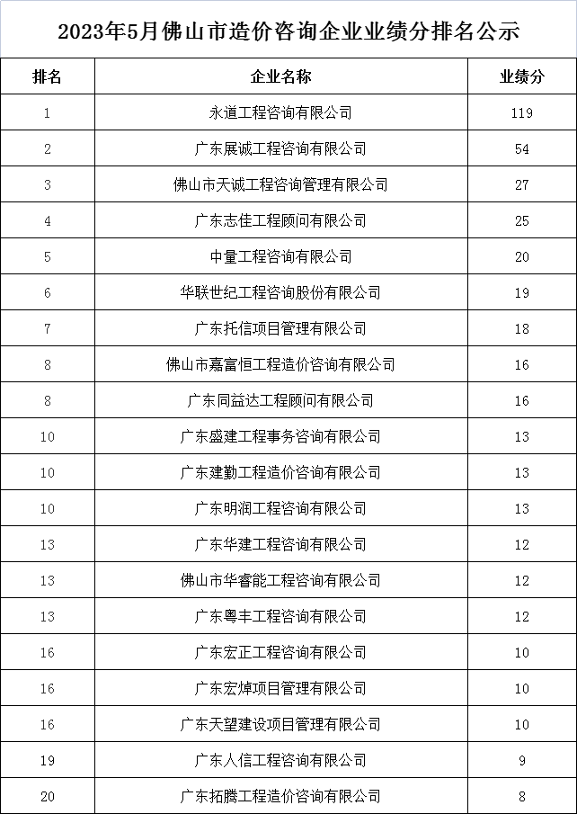 2023年5月佛山市造价咨询企业业绩分排名公示