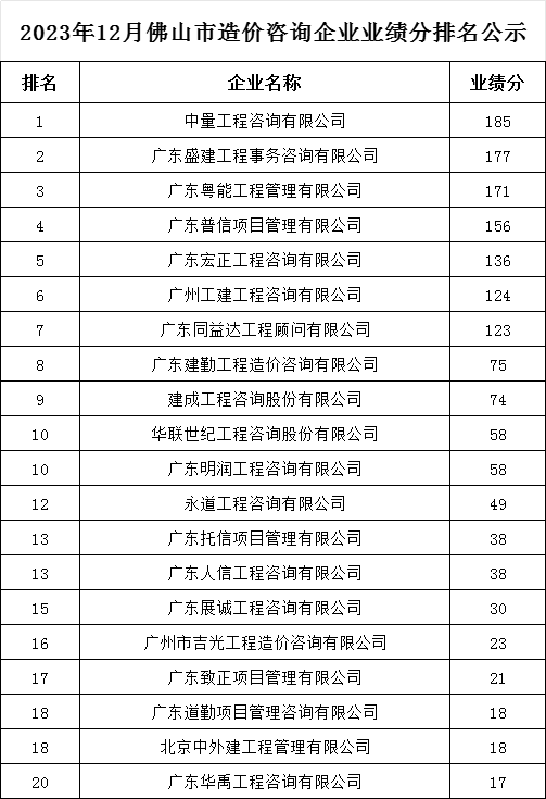 转发 | 2023年12月佛山市造价咨询企业业绩分排名公示