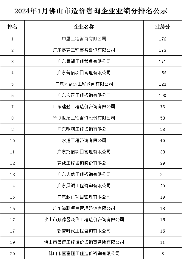 转发 | 2024年1月佛山市造价咨询企业业绩分排名公示