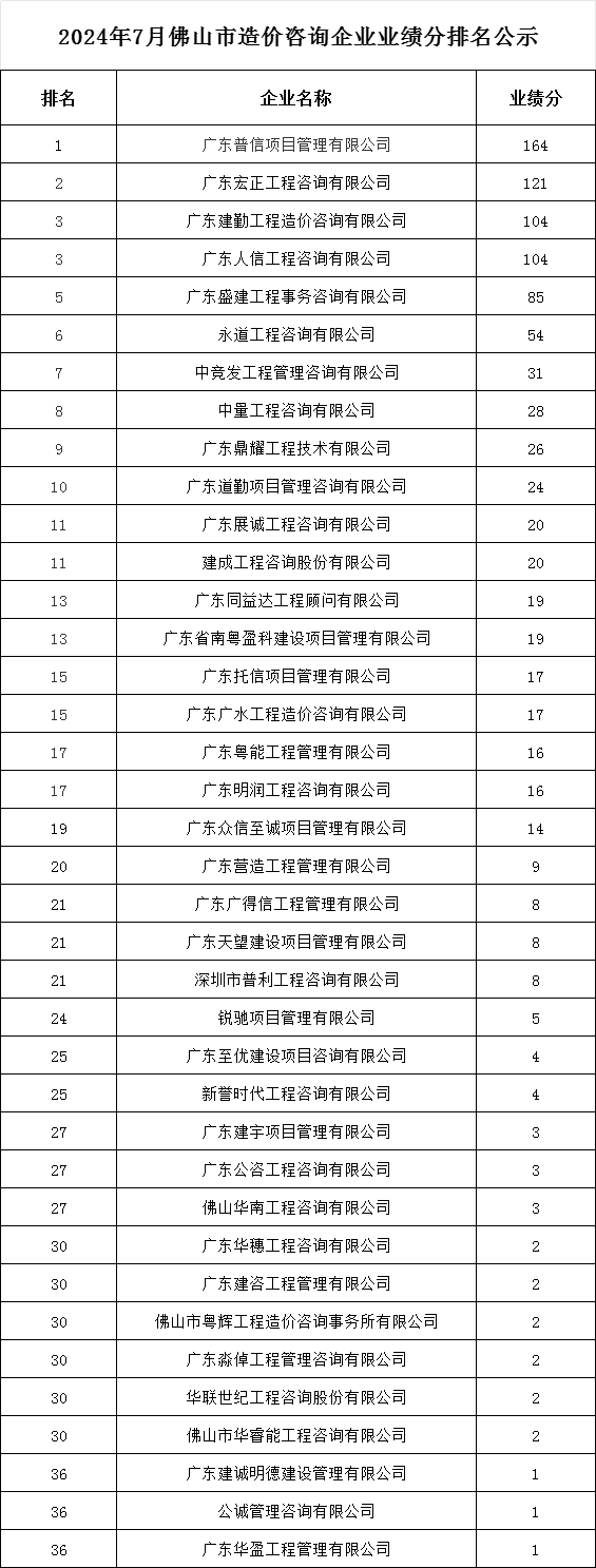 转发 | 2024年7月佛山市造价咨询企业业绩分排名公示