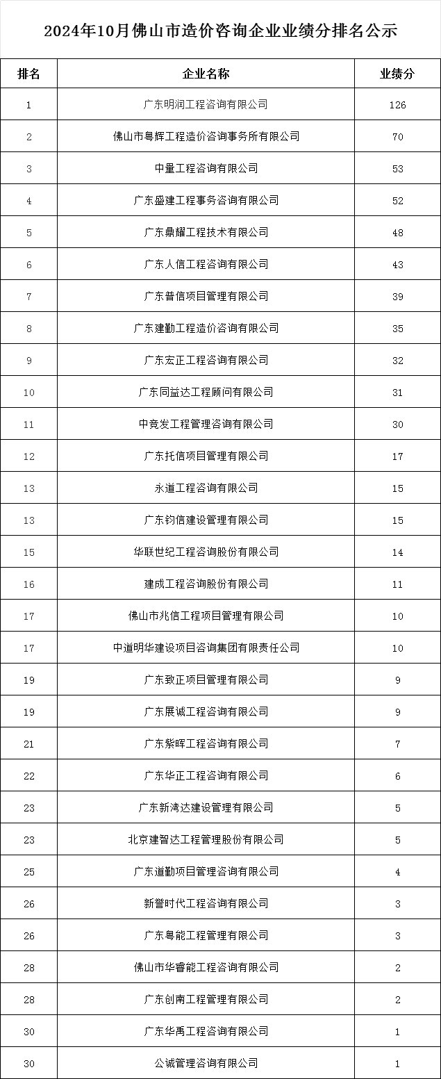 转发 | 2024年10月佛山市造价咨询企业业绩分排名公示