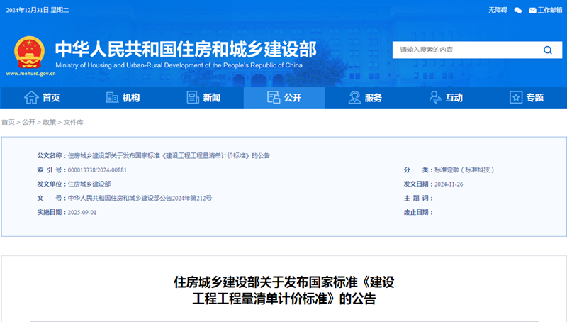重磅!住建部发布国家标准2024版《建设工程工程量清单计价标准》,自2025年9月1日起实施!