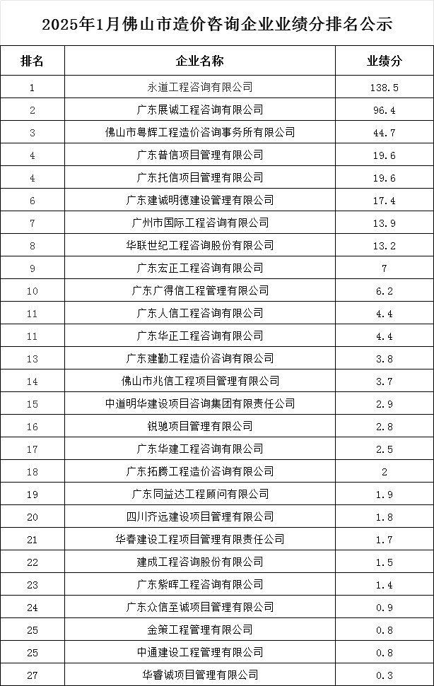 转发 | 2025年1月佛山市造价咨询企业业绩分排名公示