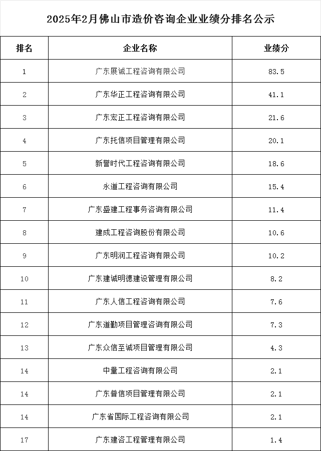 转发 | 2025年2月佛山市造价咨询企业业绩分排名公示