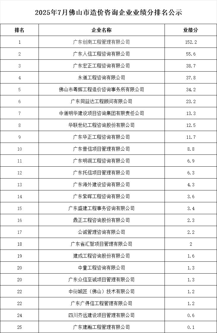 转发 | 2025年7月佛山市造价咨询企业业绩分排名公示