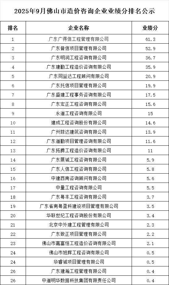 转发 | 2025年9月佛山市造价咨询企业业绩分排名公示
