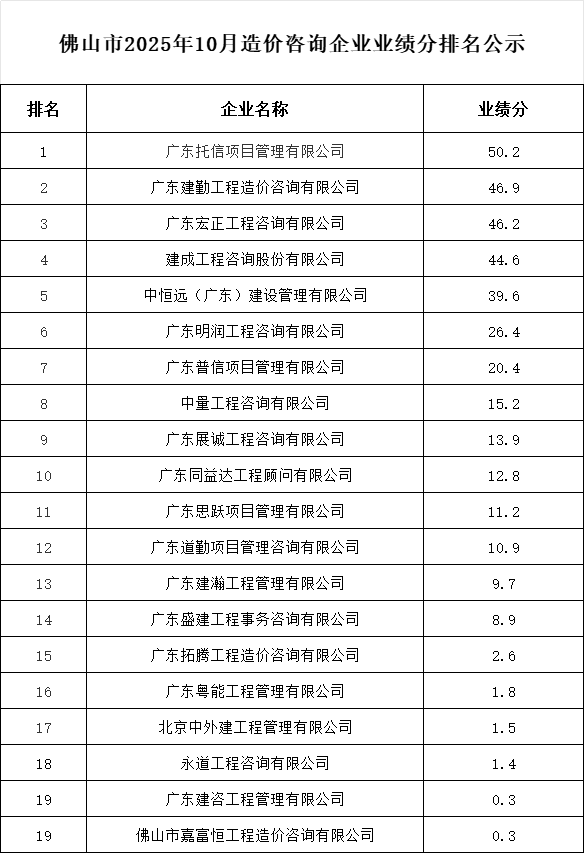 转发 | 佛山市2025年10月造价咨询企业业绩分排名公示