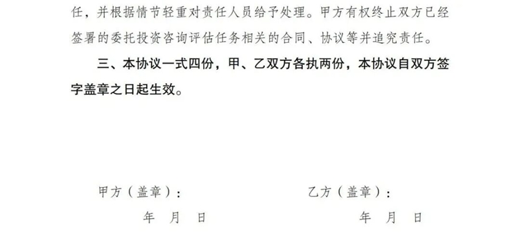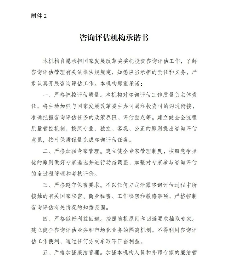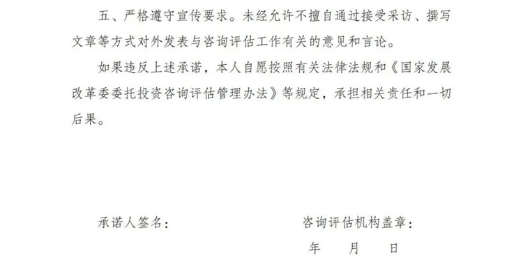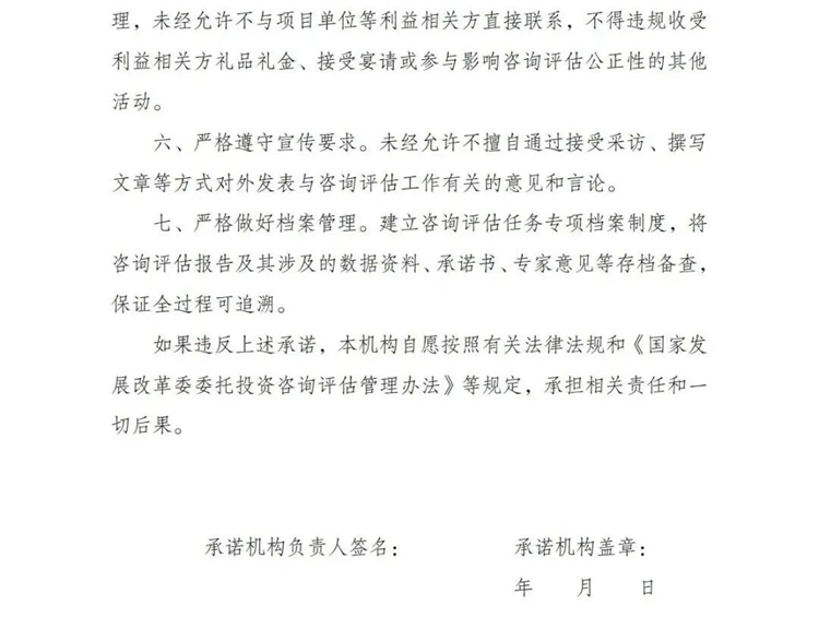 第十条 咨询评估机构、参与咨询评估的专家和相关工作人员应当签订承诺书。咨询评估机构的承诺书由其法定代表人签署、咨询评估机构盖章,并报国家发展改革委。参与咨询评估的专家和相关工作人员的承诺书由本人亲笔签署,并由咨询评估机构存档备查。
