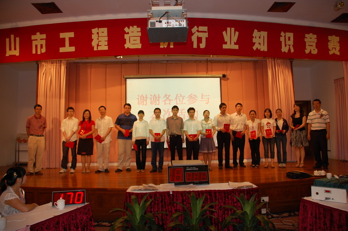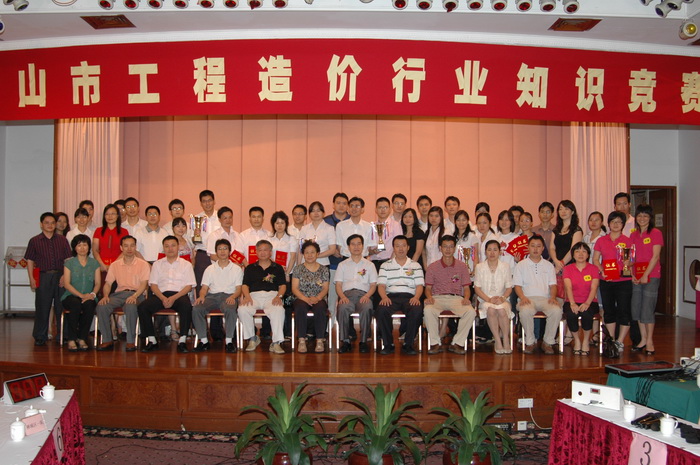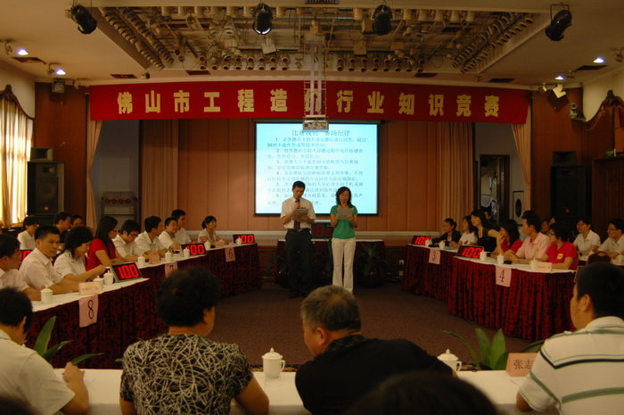 全市工程造价行业知识竞赛2008年7月2日上午在佛山市禅城区佳宁娜大酒店中华厅举行。全市五区和外地驻市造价咨询企业派出的11支队伍共33人参加竞赛,各参赛区、企业也组织了啦啦队助兴。竞赛过程场面气氛活跃、紧张、热烈、有序。经过激烈的角逐,禅城区二队(佛山市紫晖公司队)夺得第一名,南海区一队(佛山智勤、南海宏正、南海创南公司队综合组队)、顺德区二队(顺德人信公司队)夺得第二名,禅城区一队(佛山市同益达公司队)、高明区队(高明建信公司队)、外地驻市一队(广东中量公司队)夺得第三名,顺德区二队、南海区二队、三水区一、二队、外地驻市二队等五支参赛队获优胜奖,顺德区、南海区获得优秀组织奖。