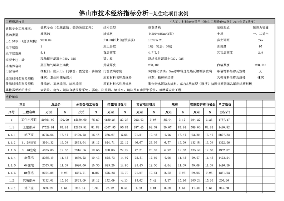 佛山市2016年第2季度技术经济指标分析—某住宅项目案例