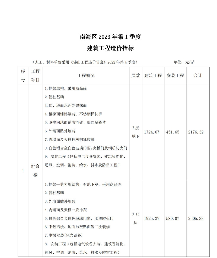 南海区2023年第1季度建筑工程造价指标