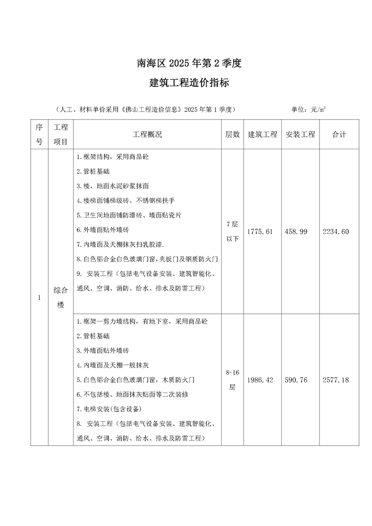南海区2025年第2季度建筑工程造价指标